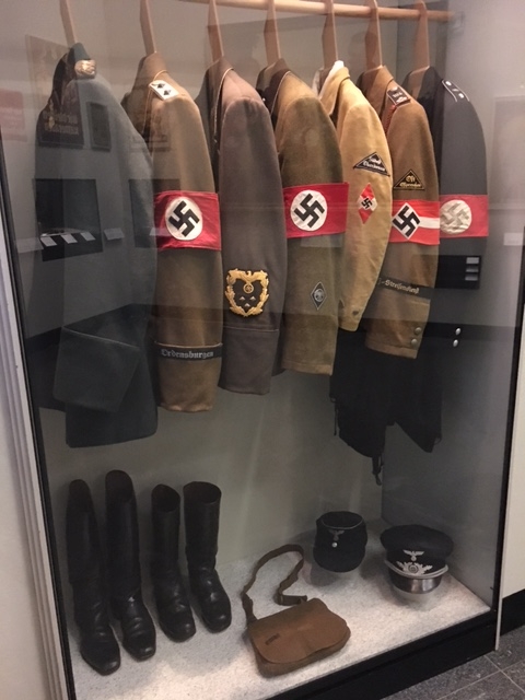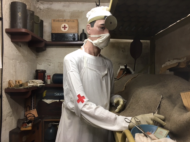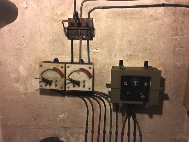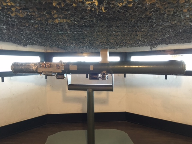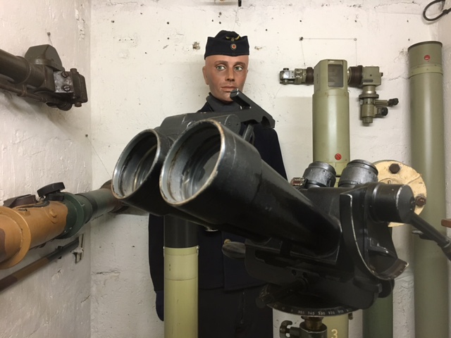 Replica of life in a bunker fire control center. Manned by over 20 men, they targeted allied ships for a battery of 4 large 152 mm guns. These guns were capable of firing projectiles weighing several thousand pounds many miles.